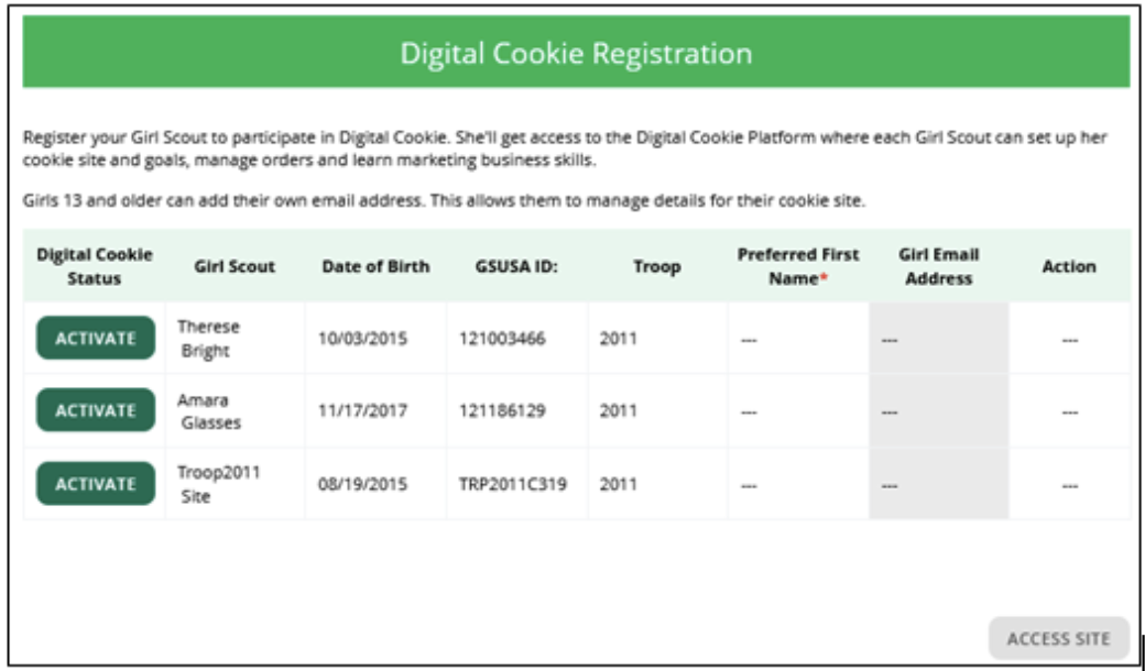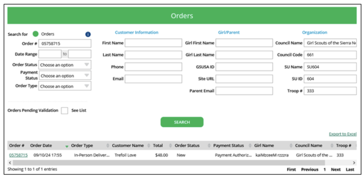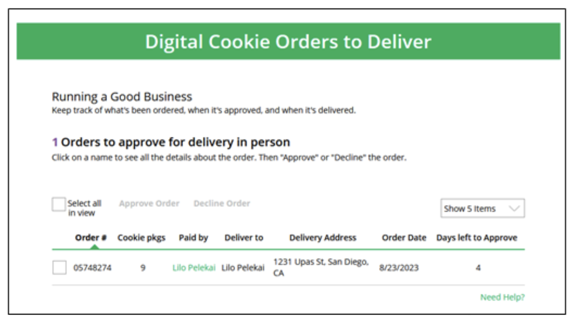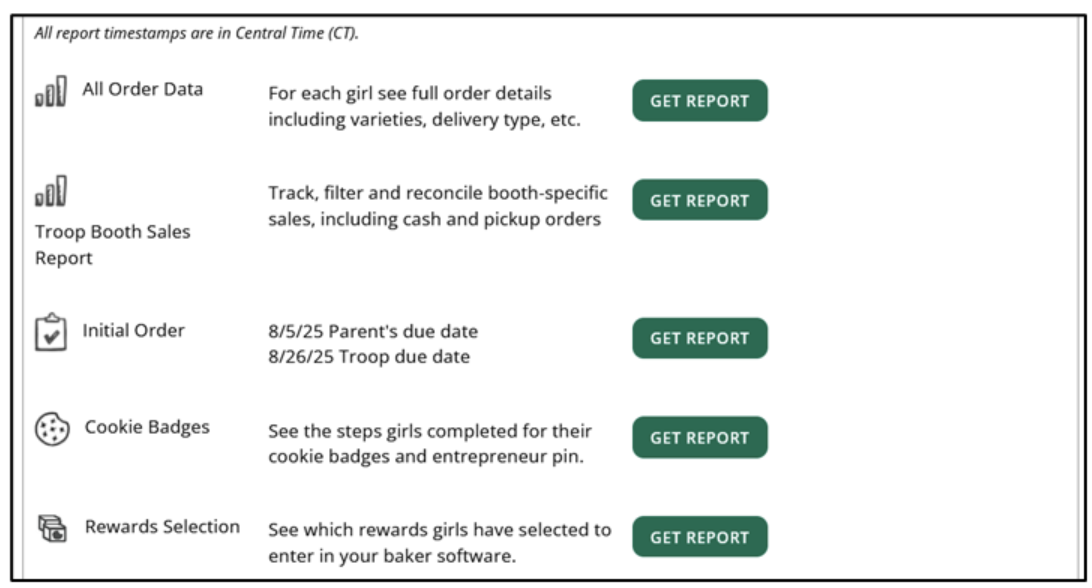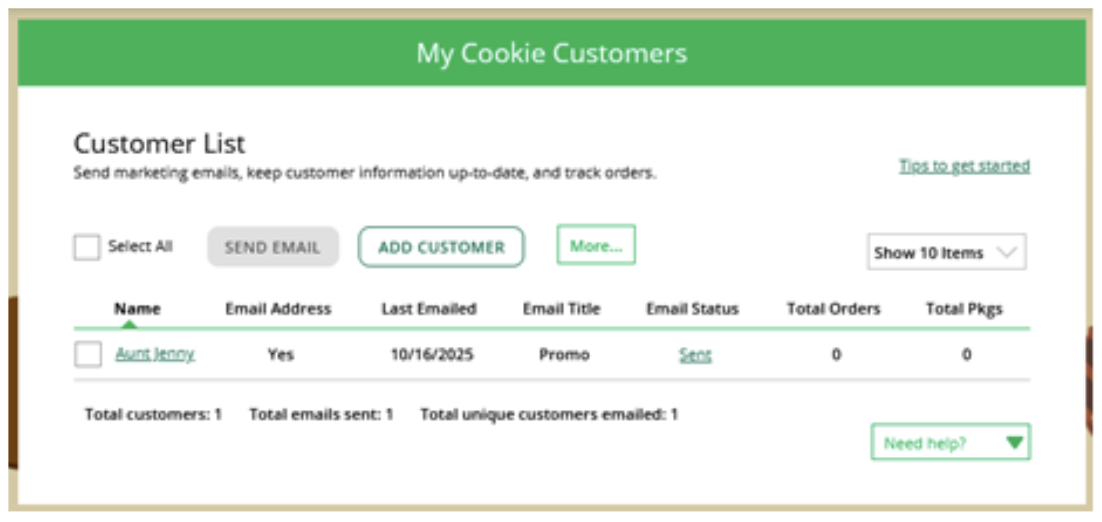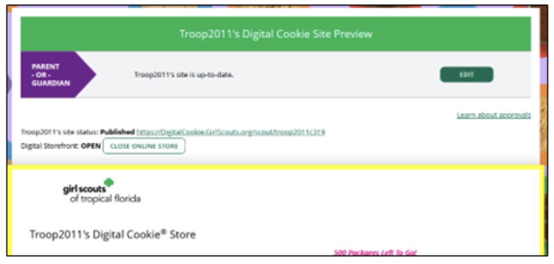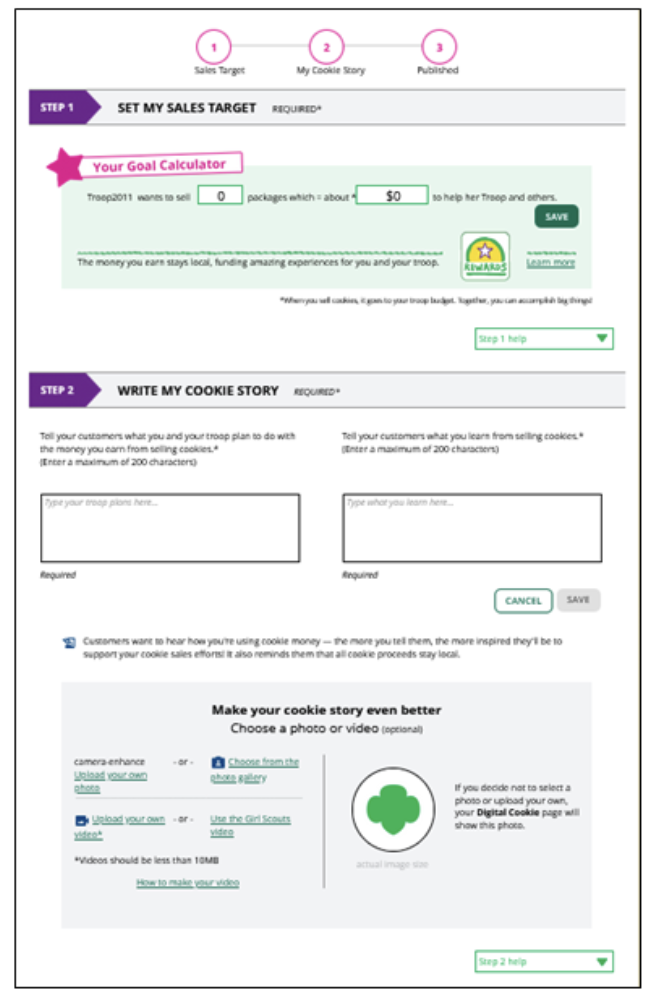 The Troop Dashboard provides an overview of all activity for your troop. Set a troop goal and watch the troop achievement bar progress as cookies are assigned to Girl Scouts in the troop. Key stats include: