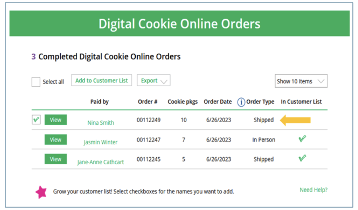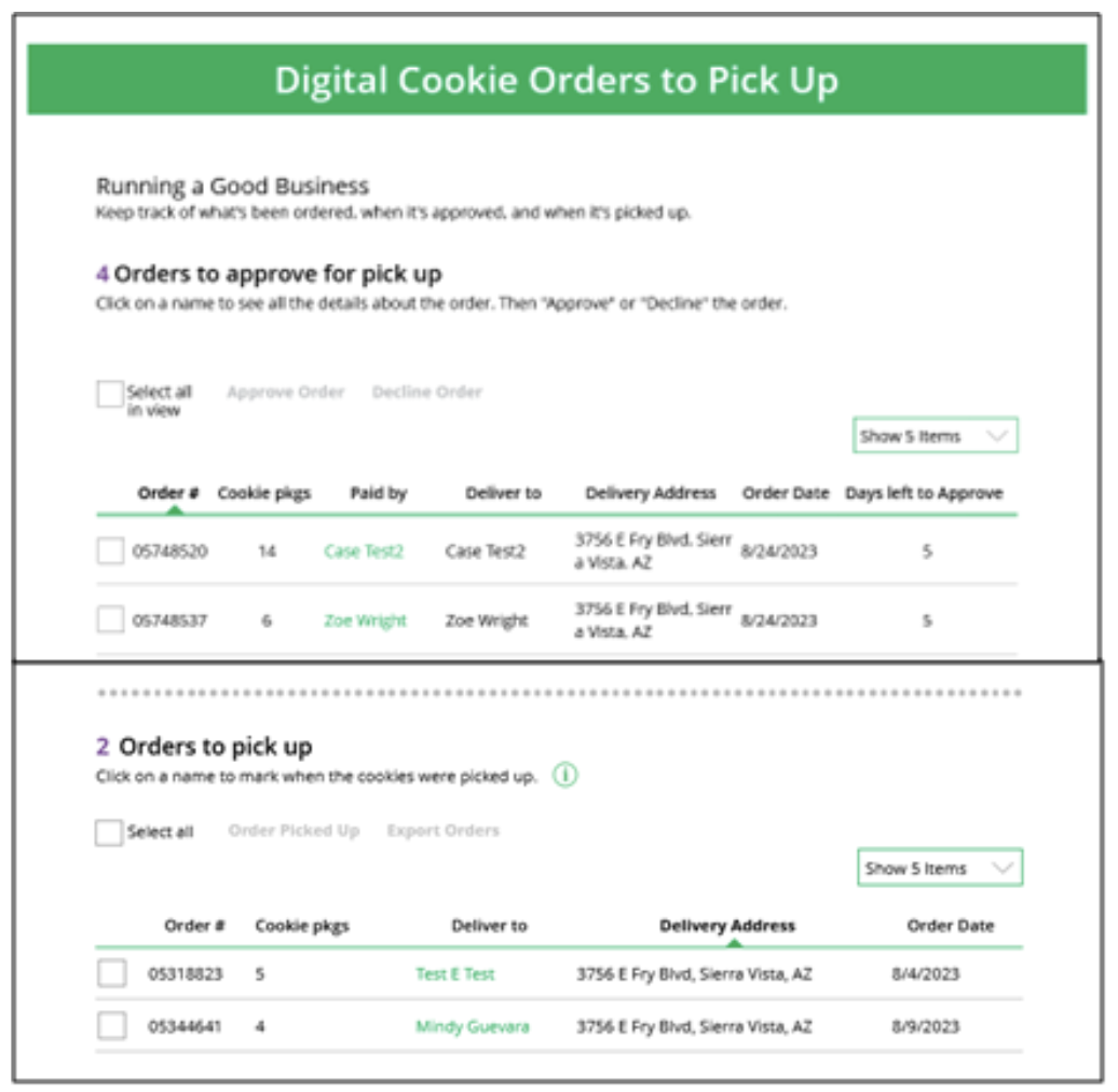The middle section is where you can see the transfers in and out of the girl’s inventory. This girl had 43 cookies given to her (22 non-booth, 21 booth) and she gave 14 back to the Troop.
