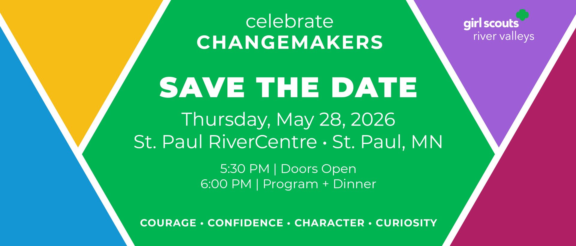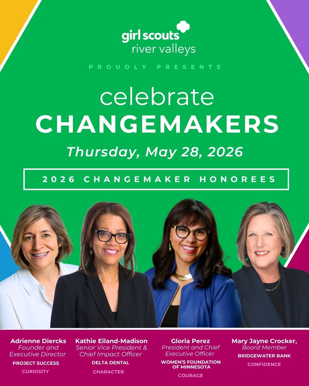 Celebrate Changemakers is a moment for our community to come together around something powerful: the belief that when girls are given the opportunity to lead, our world becomes stronger. At Girl Scouts River Valleys, we see every day what happens when girls are trusted with big ideas, real responsibility, and the support to discover their voice. On Thursday, May 28, 2026, we invite you to join us for an evening that celebrates the leaders helping to shape Minnesota’s future—while investing in the girls who will lead it next. Your presence and participation help ensure that thousands of girls across our region have access to the experiences that build confidence, courage, curiosity, and character.